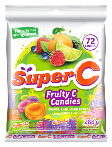 With fun fruity flavours, Super C is available in the original compressed rolls, fruitastic boiled candy and now in a sparkling glucose drink.